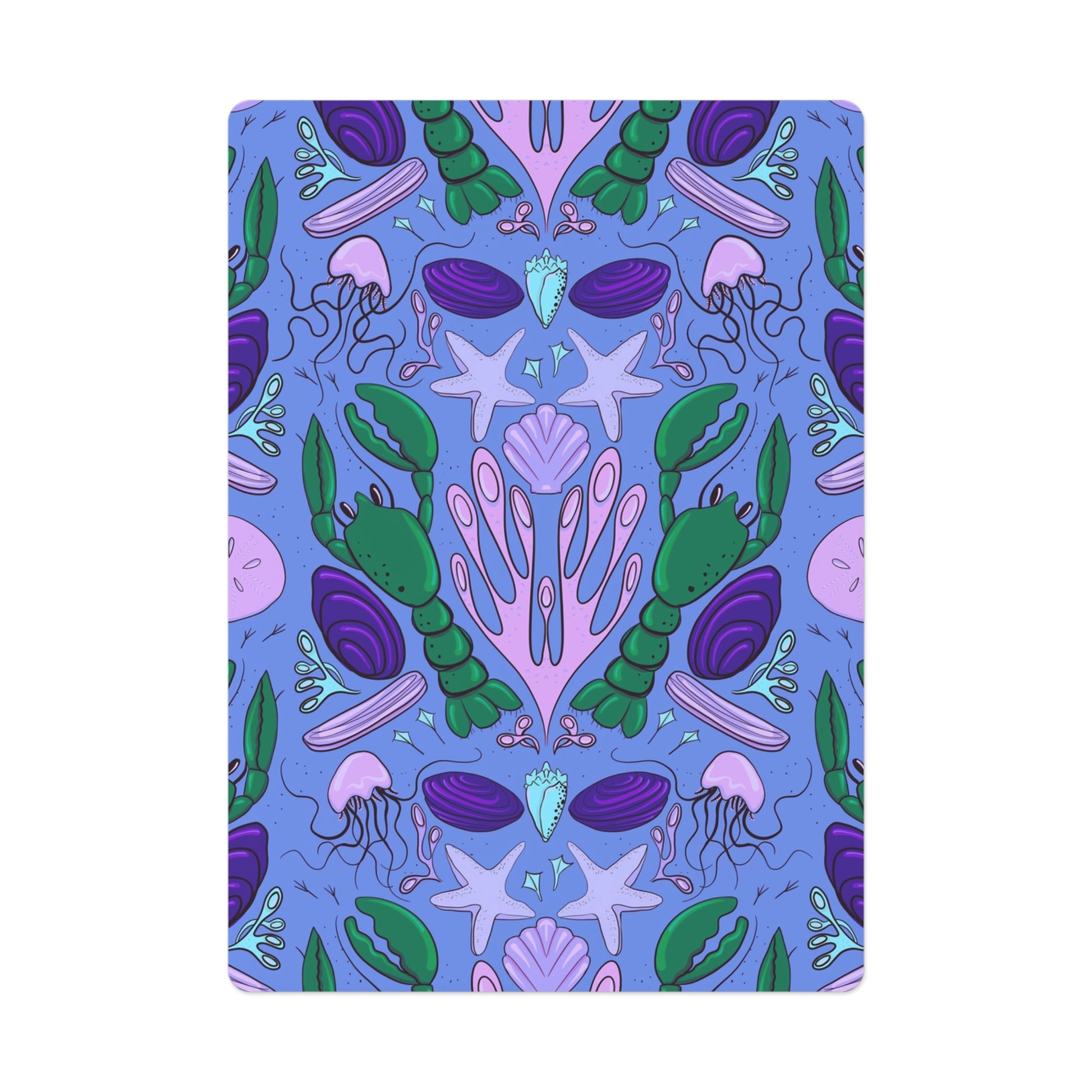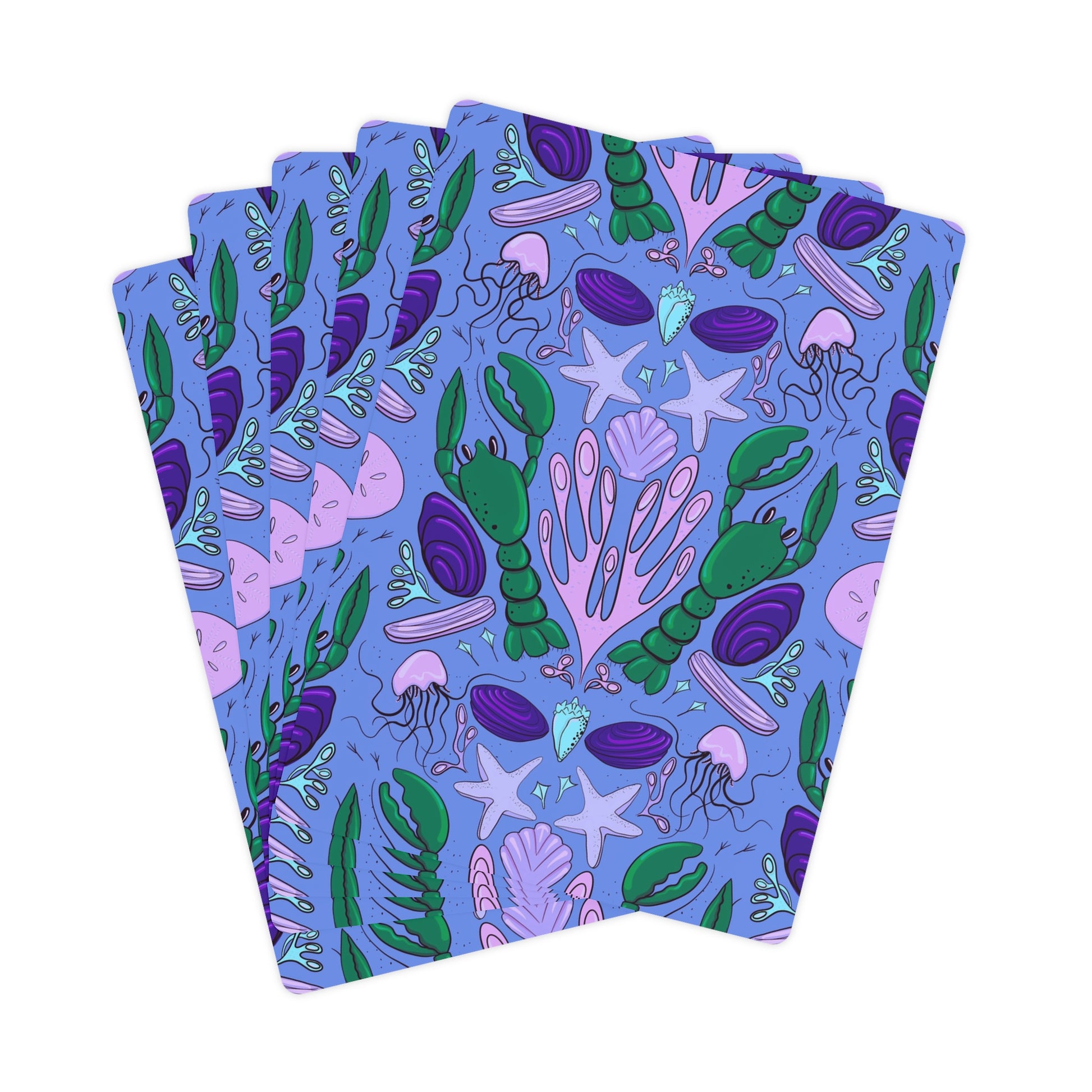 This brightly coloured seaside pattern is full of beach treasures one might find on a Summer's day! Lobsters, clams, jellyfish, starfish, scallops, razor clams and seaweed are surrounded by little seagull "foot" prints! You can't help but have a winning hand with this fun and classic design!