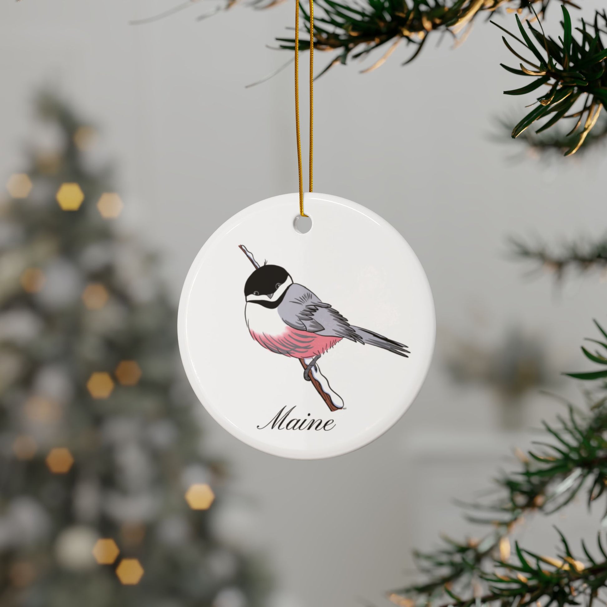 Take a piece of Maine home with you to hang on your wall or your tree! Made with durable ceramic, these ornaments feature a two-sided print of Maine's state bird, the chickadee. Offering bundles of 1, and 3, 5 and 10 pieces; keep one for you and share with friends or sprinkle throughout your tree!