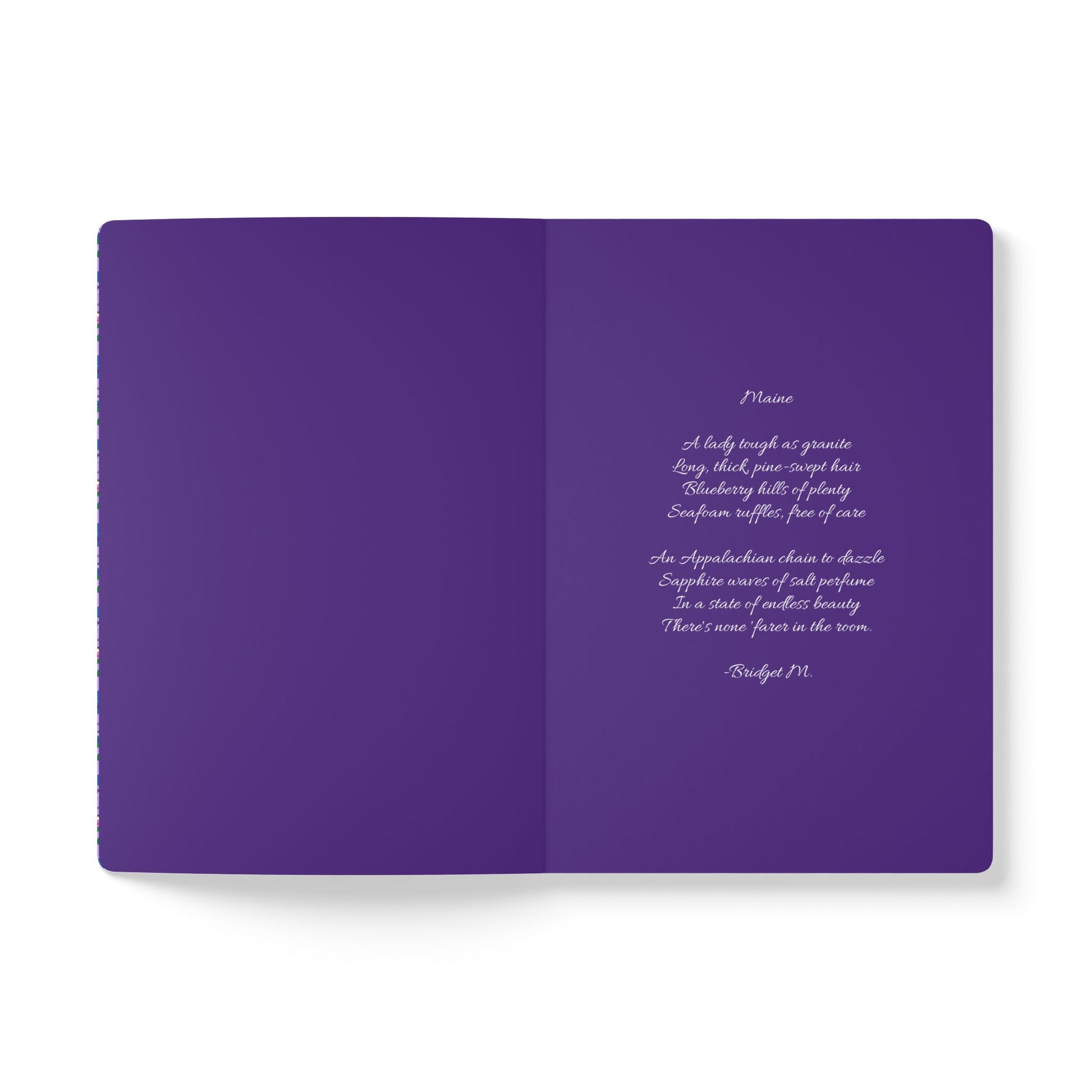 This richly toned journal features the state of Maine on the cover along with a sprig of wild blueberries, one of Maine's most famous crops. Inside you will find a brightly coloured blueberry pattern on both the front and back covers, a page to personalize who the journal belongs to, and a short, two-stanza tribute to the beauty of Maine.